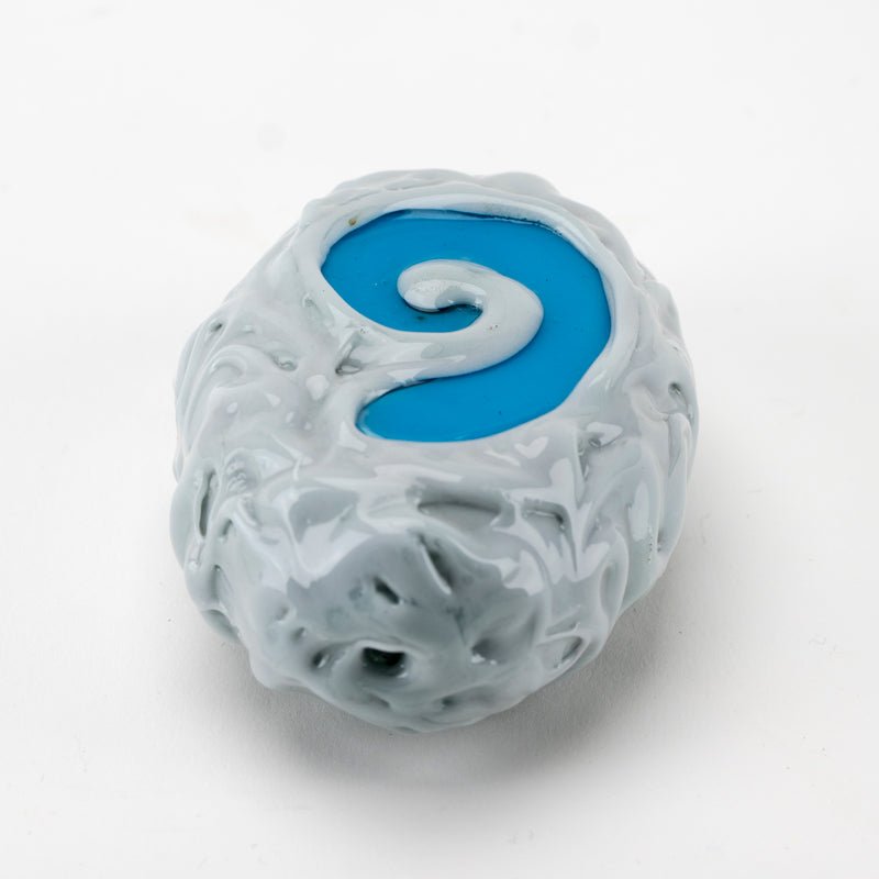Before going straight into a dungeon use this Stone of Hearth Dry Pipe to go prepare for such an event! This particular piece is made of strong borosilicate glass meant to last. This piece also features a bumpy texture, and a bright baby blue emblem on the top, with the carb being on the back side of the bowl. This piece will "WOW" anyone who sees it.